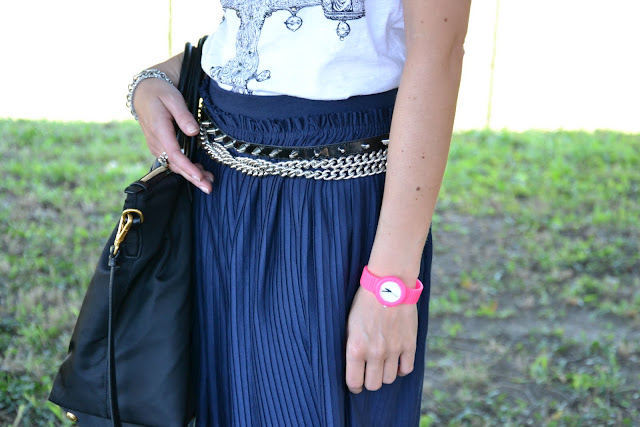 Per evitare un effetto scontato da educanda, meglio non abbinarla a camicette. Io ho preferito una canotta dallo stile un pò gotico, con borchie e paillettes, insieme alla cintura dal sapore metal, con catena e borchie.