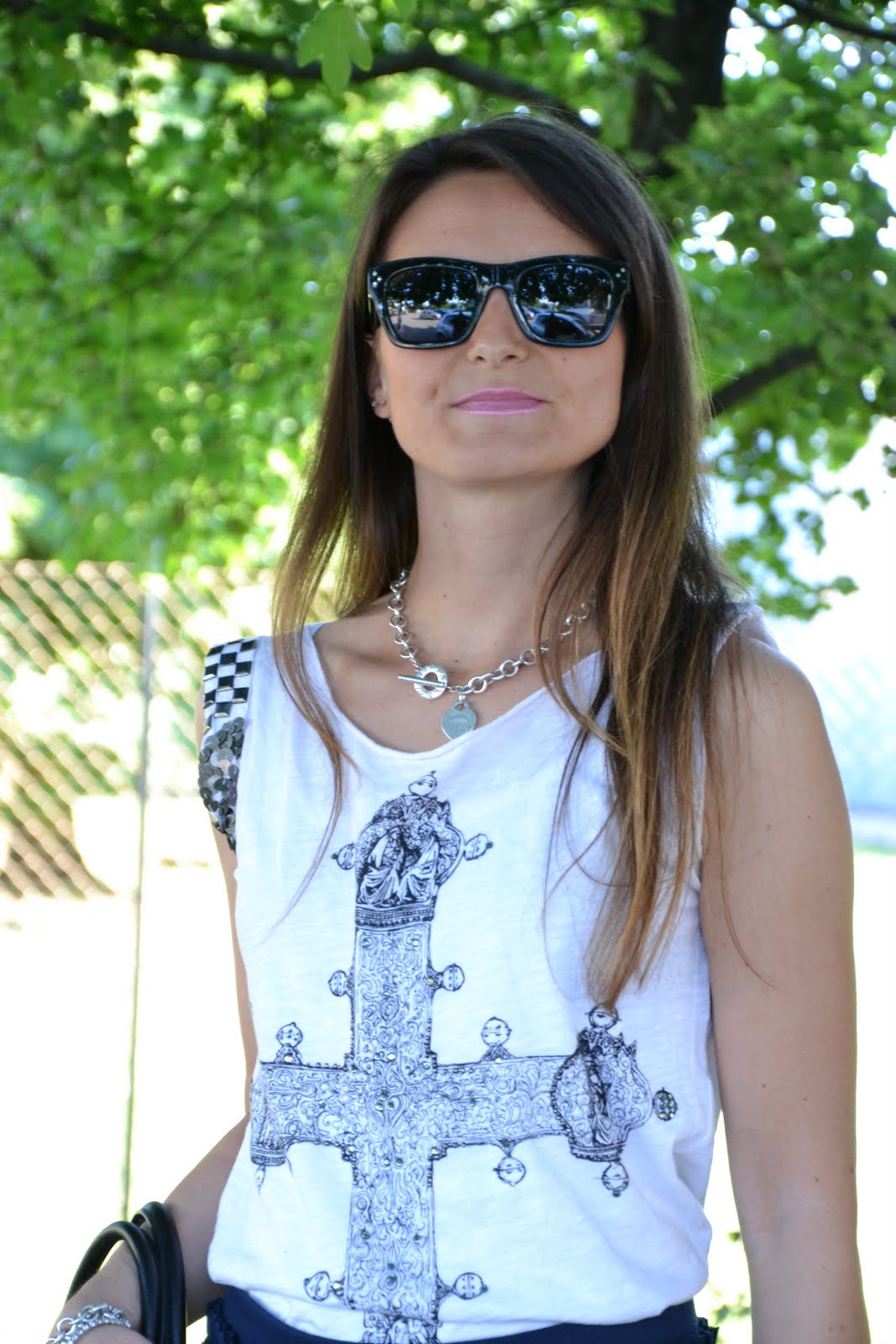Per evitare un effetto scontato da educanda, meglio non abbinarla a camicette. Io ho preferito una canotta dallo stile un pò gotico, con borchie e paillettes, insieme alla cintura dal sapore metal, con catena e borchie.
