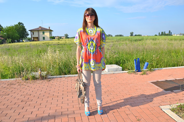 Good morning and good week! Today, it’s a gray, rainy day in many regions of Italy, what could be better than a little ‘color to be happy? To begin with, these photos were taken a few days ago, in a beautiful sunny day. Then, I tell you that this blouse cost me only 3 euros. All these colors put me in a good mood! Finally, just look at my funny face and … here I know, you‘re already running a smile, right? A big kiss!