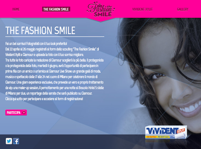| Che ne dite di partecipare ad un simpatico concorso promosso da Glamour in collaborazione con Vivident Xylit? Fatevi fotografare e sfoggiate un bel sorriso, e dopo esservi registrate QUI caricate la vostra foto. Il sorriso più bello vincerà la possibilità di partecipare ad una straordinaria esperienza: il Glamour Live show, un galà di moda, musica e spettacolo, che si terrà l’11 giugno a Milano. Una giornata da sogno, che prevede un trattamento da vip: make up, pernottamento presso il Boscolo Hotel per due persone e un reportage che sarà poi pubblicato su Glamour. Bè? Che fate ancora li a bocca aperta con gli occhi sognanti? Correte su questo link, vi si aprirà una pagina come quella che vedete in copia qui sotto, con tutto il regolamento. Siete in tempo fino al 26 maggio! Vi auguro in bocca al lupo e vi lascio una carrellata di bellissimi sorrisi per una buona giornata! |