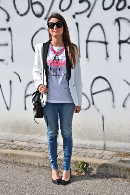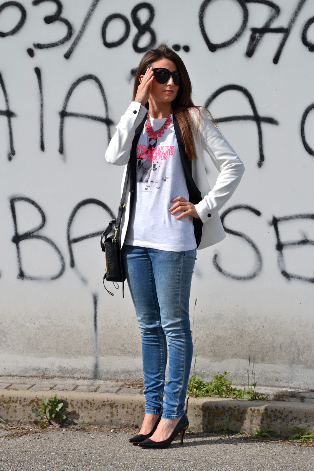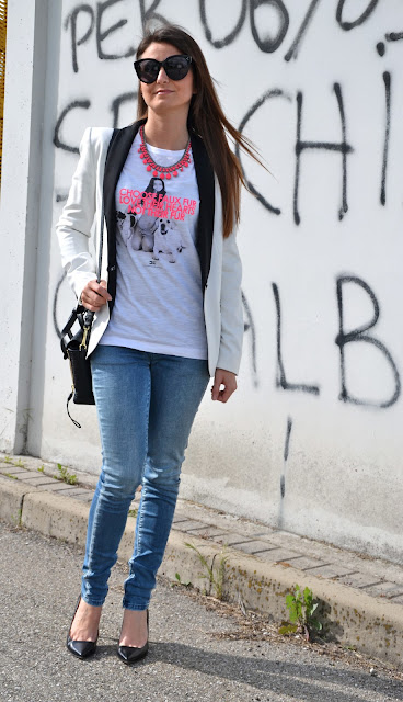 My beloved wall is back! And also the white blazer that you had already seen last year HERE. But the thing I most like about this look is the tee. By now you know that I am a great admirer of jeans and tee, and I find this really cute, because there is a picture of a labrador, my favorite dog, and the message he brings: choose faux fur animals and appreciate their sweetness and affection! And I would add: stop abandon of animals, but how can you be so bad?? Stop!