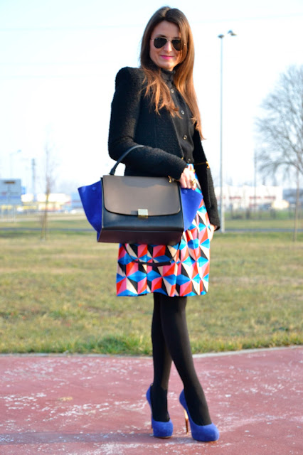 I like the graphic print of your skirt. Also love the blue shade which matches with your Celine bag and shoes. So chic!