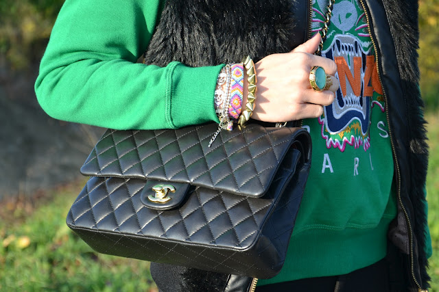 Sweatshirt: Choies; pants: Zara (old); faux fur jacket: Pull and bear (old); bag: Chanel; sunnies: vintage; bracelets: no brand, made by me, Tiffany and Bray Steve Alan; boots: Zara (old); ring: YSL.
