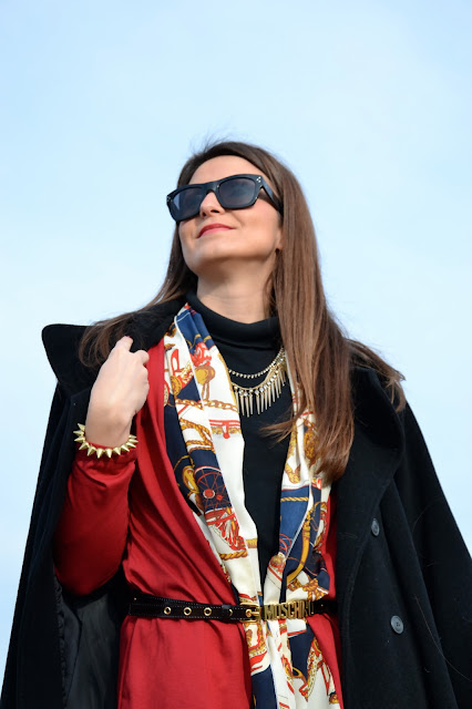 Cardigan: Oasap; coat: no brand; belt: Moschino; pants and boots: Zara; turtleneck: Tezenis; necklace: HM; sunnies: Cèline.