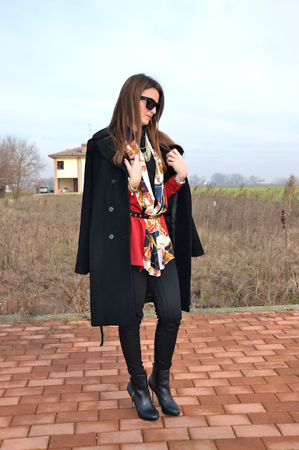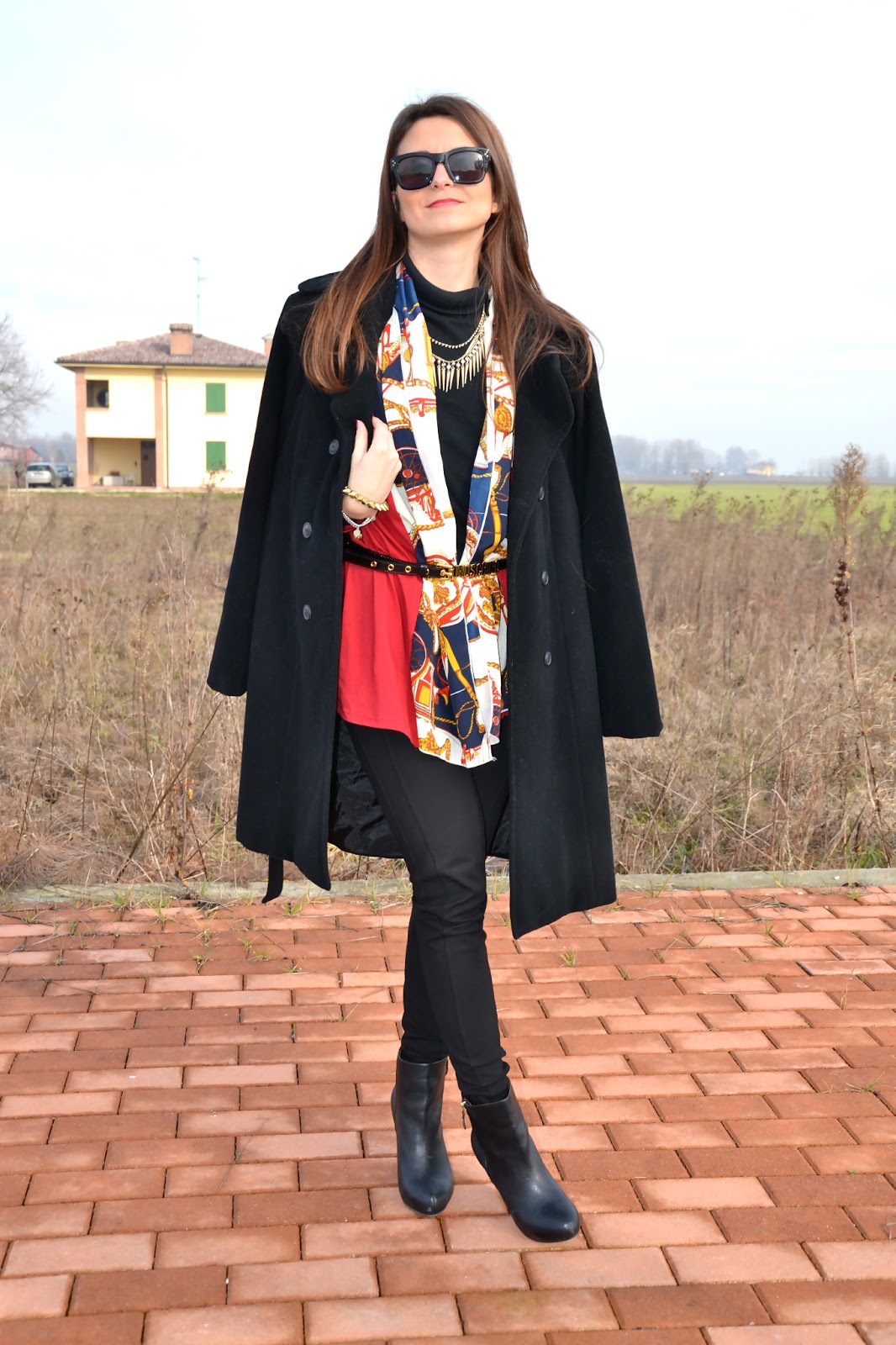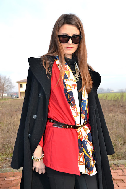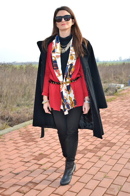 Cardigan: Oasap; coat: no brand; belt: Moschino; pants and boots: Zara; turtleneck: Tezenis; necklace: HM; sunnies: Cèline.