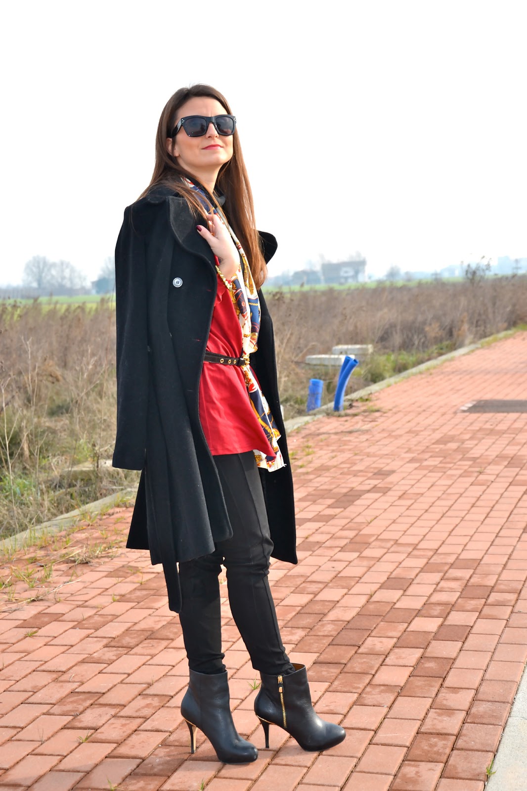 Cardigan: Oasap; coat: no brand; belt: Moschino; pants and boots: Zara; turtleneck: Tezenis; necklace: HM; sunnies: Cèline.