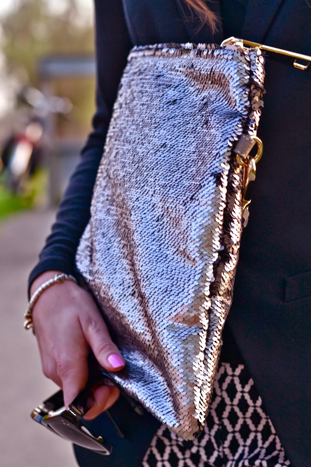 Oggi sono riuscita a trovare il giusto compromesso tra comodità ed eleganza: ho rispolverato dall’armadio un tuxedo che avevo dimenticato di avere, e avevo dimenticato anche la sua versatilità. Ho deciso di abbinarlo ad una maglia nera e a pantaloni stampati. Il pezzo forte è la maxi clutch di AGL in paillettes argento, di gran tendenza quest’anno. La trovo bellissima e molto comoda perchè si può trasformare in una borsa a spalla che presto vi farò vedere in altri outfits. Un abbraccio!  Today I managed to find the right balance between comfort and elegance: I dusted off the closet a tuxedo that I had forgotten to have, and I had also forgotten his versatility. I decided to pair it with a black shirt and printed pants. The highlight is the maxi sequined clutch by AGL , hot trend of this year. I find it really beautiful and very comfortable because it can be transformed into a shoulder bag that you‘ll soon see in other outfits. kisses!