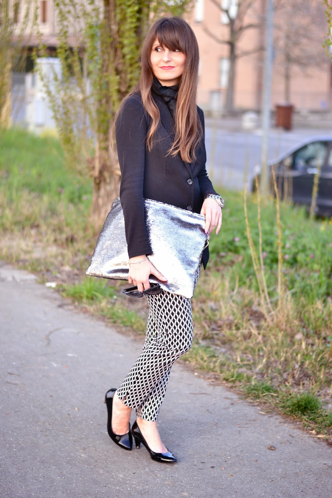 Oggi sono riuscita a trovare il giusto compromesso tra comodità ed eleganza: ho rispolverato dall’armadio un tuxedo che avevo dimenticato di avere, e avevo dimenticato anche la sua versatilità. Ho deciso di abbinarlo ad una maglia nera e a pantaloni stampati. Il pezzo forte è la maxi clutch di AGL in paillettes argento, di gran tendenza quest’anno. La trovo bellissima e molto comoda perchè si può trasformare in una borsa a spalla che presto vi farò vedere in altri outfits. Un abbraccio! Today I managed to find the right balance between comfort and elegance: I dusted off the closet a tuxedo that I had forgotten to have, and I had also forgotten his versatility. I decided to pair it with a black shirt and printed pants. The highlight is the maxi sequined clutch by AGL , hot trend of this year. I find it really beautiful and very comfortable because it can be transformed into a shoulder bag that you‘ll soon see in other outfits. kisses! |