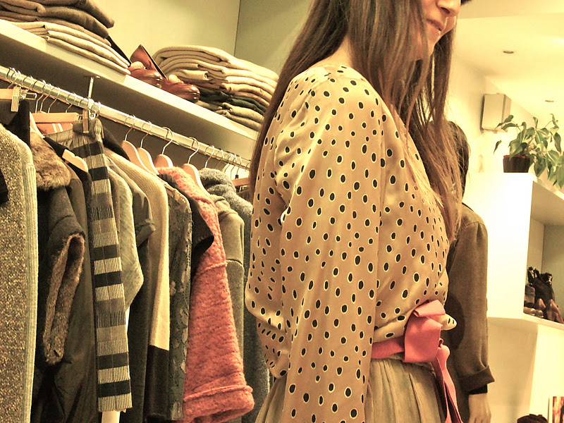 (quante belle cose, mamma miaaa, comprerei tutto!!!) Quello che alla fine mi ha ispirato di più è questo: camicia a pois abbinata a questa romantica gonna, a cui ho voluto dare un tocco più “urban” con gli stivali comodi e caldissimi di Ash. Le luci del negozio e la macchinetta scarsa con cui mi sono state scattate le foto fanno sembrare il tutto piuttosto giallino, ma in realtà camicetta e gonna sono in due diverse tonalità di rosa cipria (il colore reale è quello della foto qui sotto). La gonna è meravigosa, ed è stata proposta in ben 4 versioni di colore, due delle quali sono già esaurite. In negozio è rimasta solo verde petrolio e rosa champagne. Entrambe stanno benissimo con quella camicetta!  E voi quale versione preferite? Rosa su rosa o camicetta rosa su gonna verde?