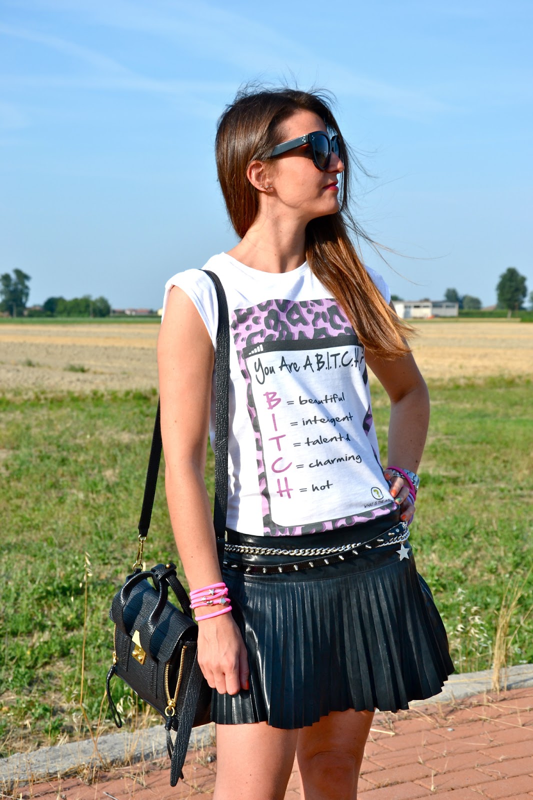 Tee: What is the answer; skirt and belt: Denny Rose (old); shoes: no brand; bag: Phillip Lim; sunnies: Cèline; bracelets: My life-my passion.