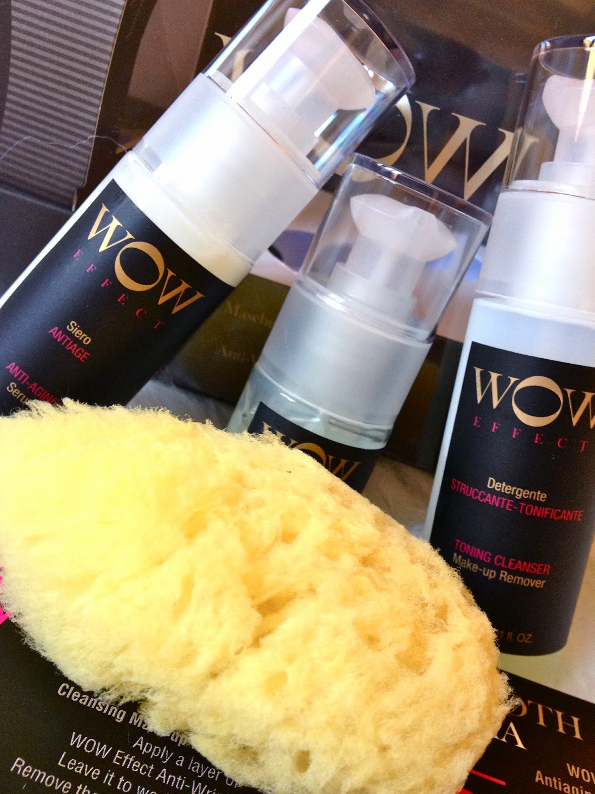 Buongiorno e buon sabato a tutti! Oggi vi parlo di un set di prodotti per il viso che ho avuto l’opportunità di provare e che sto tuttora utililzzando con soddisfazione: WOW Effect. Il bel cofanetto che vedete qui sopra contiene tutto il necessario per la cura del viso, nel rispetto anche delle pelli più sensibili, come la mia. Vi dico subito che la confezione è talmente carina che quasi mi dispiaceva aprirla. Nel lato sinistro si trova una spugna naturale, nel lato destro il manuale che ci insegna ad utilizzare correttamente i prodotti, e dietro, una busta color perla che contiene in breve il recap della filosofia WOW Effect: LAVA, STENDI, STIRA. No, non il bucato, la vostra pelle! Infatti con tre passaggi la pelle è perfettamente pulita, distesa e idratata, grazie ai tre ottimi prodotti contenuti nel cofanetto: 1)Detergente struccante tonificante (che non secca la pelle), 2) Maschera Antirughe (la adoro) 3) Siero Anti-Age (adoro pure lui). Questi prodotti vanno utilizzati insieme, perchè lavorano in sinergia tra loro. La maschera va utilizzata una volta alla settimana, mentre siero e detergente tutti i giorni. Come in tutti i trattamenti anti-age, i benefici si percepiscono nel tempo, con un utilizzo quotidiano e corretto dei prodotti. Dopo averli utilizzati alcuni giorni vi posso dire che sono veramente soddisfatta e sto apprezzando una certa luminosità in più nella mia pelle, inoltre le piccole rughette vicino agli occhi ora al mattino quando mi sveglio sembrano meno evidenti. Vi consiglio vivamente di provarli! PS: avete letto la mia intervista per il blog di WOW Effect? Leggetela se vi va, parlo tra le altre cose, di ciò che penso di alcuni aspetti del blogging attuale…